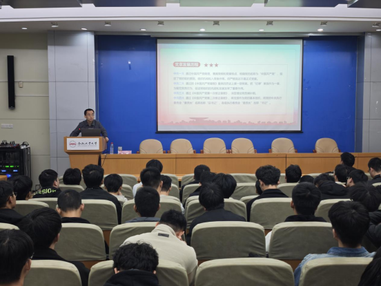 开班仪式结束后,祖磊以“学习遵守党章,增强党员意识”为题讲授党课。他系统梳理《中国共产党章程》的基本概述与发展历程,阐明二十大修改党章的重要意义,解读党的二十大关于党章(修正案)决议、二十大党章的重要修改内容。他激励同学们积极践行“有理想、敢担当、能吃苦、肯奋斗”的准则,努力成长为新时代高校青年党员,以切实行动践行工业报国的宏伟志向。