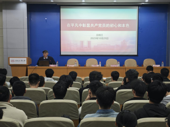 王皖江为学员们讲授党课“在平凡中彰显共产党员的初心和本色”。他以我校优秀共产党员坚守科研教学一线的典型事迹为切入点,结合自身经历,从“坚定理想信念,经得起时间考验”、“不计个人得失,经得起利益考验”、“不怕艰难困苦,经得起困难考验”、“不惧潜在危险,经得起风险考验”四个方面,深情讲述老一辈工大人扎根教育、践行工业报国志向的奋斗历程,号召全体学员传承工业报国精神,以青春之笔书写时代答卷。
